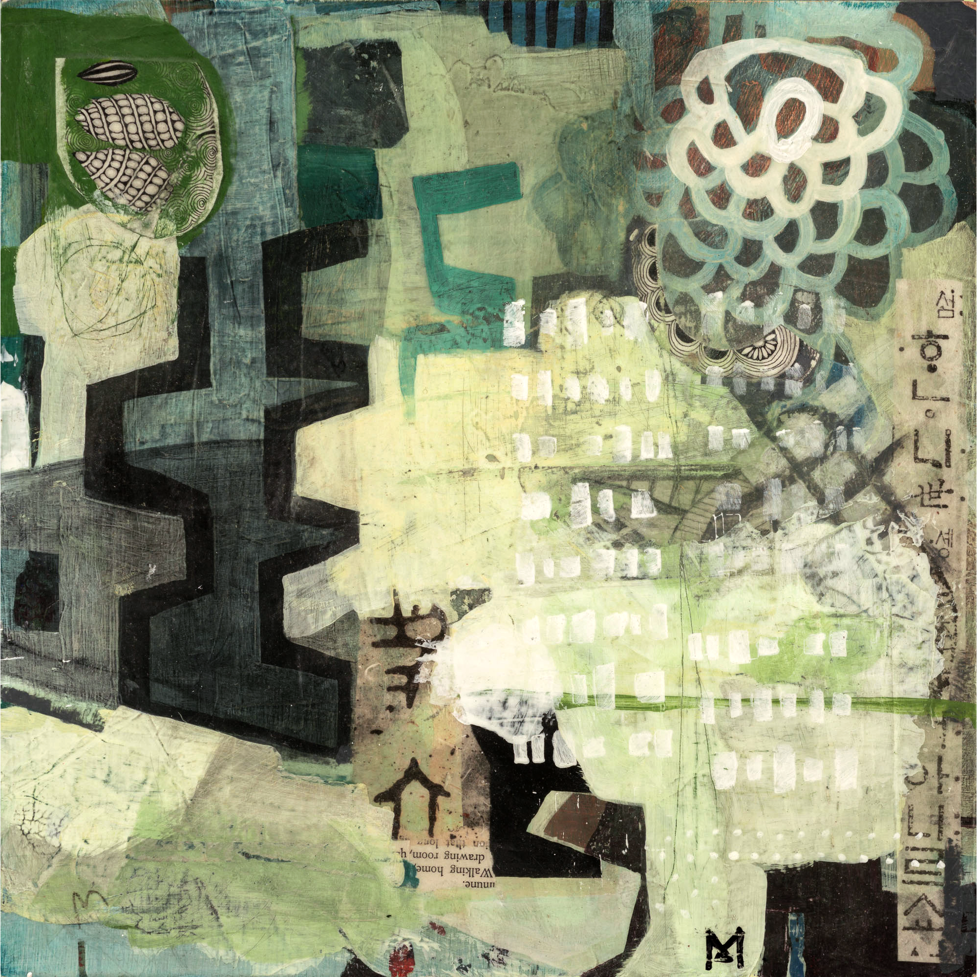 I subjectively build layers of acrylic paint and collage, working into them by scraping, scratching, sanding, and glazing. Then comes objective discernment regarding design and composition.